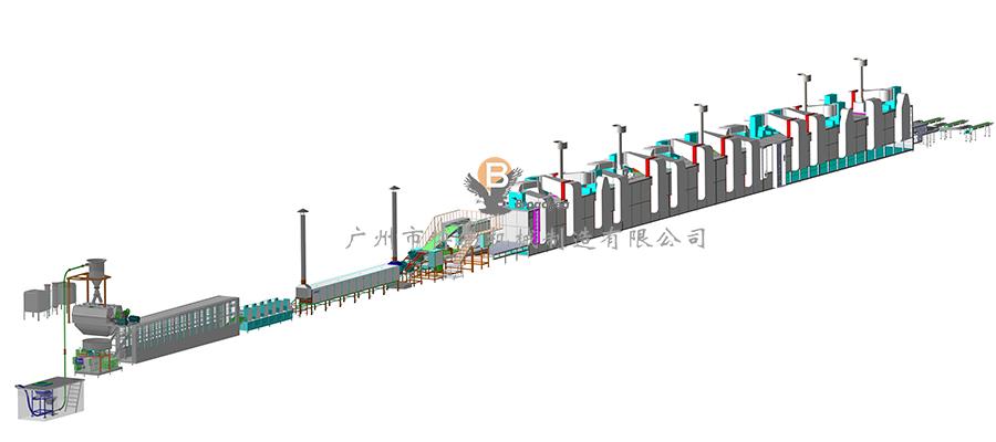 面粉過篩及風(fēng)送系統(tǒng)——鹽水計(jì)量及攪拌系統(tǒng)——和面機(jī)——喂料機(jī)——復(fù)合壓片機(jī)——連續(xù)壓片機(jī)——蒸面機(jī)——切斷(分排)落盒機(jī)——?dú)鈩?dòng)理面機(jī)——烘干機(jī)——分流輸送機(jī)——檢查輸送機(jī)——包裝